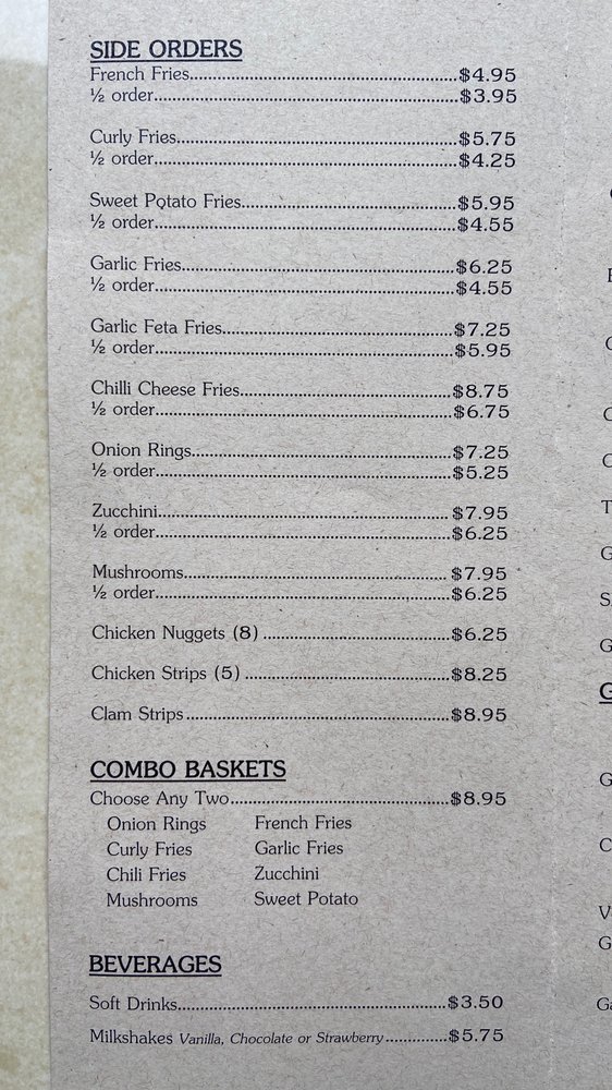 Choice of two: onion rings, mushrooms, zucchini, various fries (curly, French, sweet potato, chili, garlic).